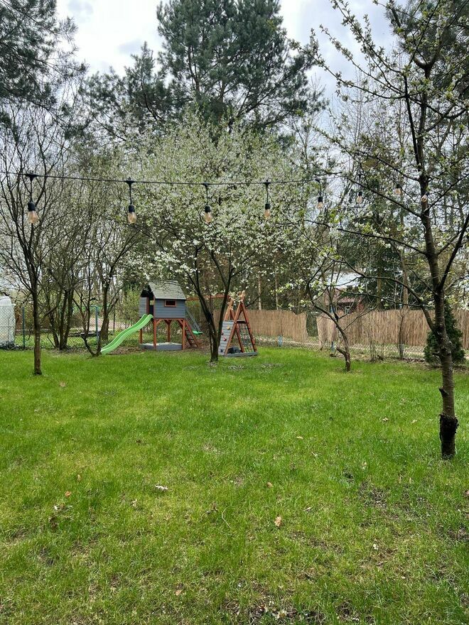 Na terenie działki rosną liczne drzewa i krzewy owocowe, a także dorodne sosny, co zapewnia prywatność i przyjemny mikroklimat.